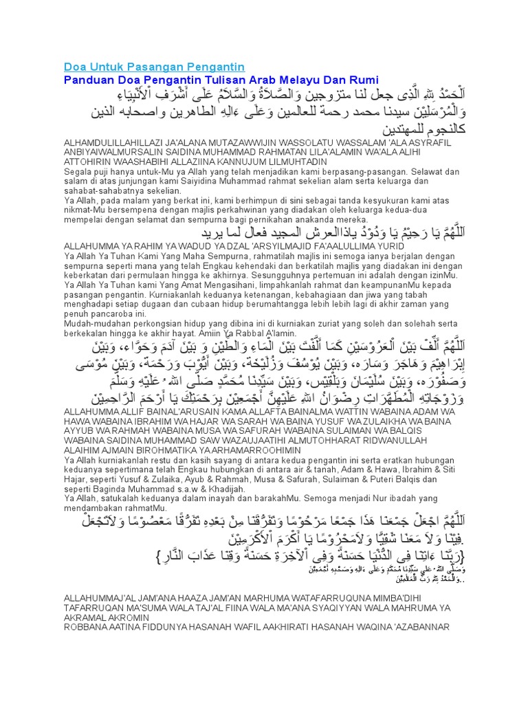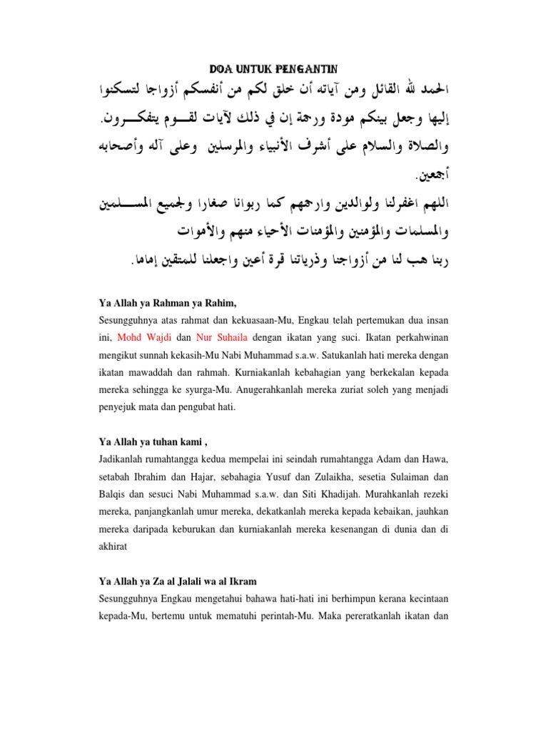 Doa untuk Pengantin Baru Bagi Mempelai Pria. Doa untuk akad nikah pengantin pada saat akan nikah disertai resepsi hendaknya dipanjatkan oleh orng-orang yang menjadi saksi atau orang-orang yang menghadirinya. Contoh doa yang boleh disebut di dalam bahasa melayu.